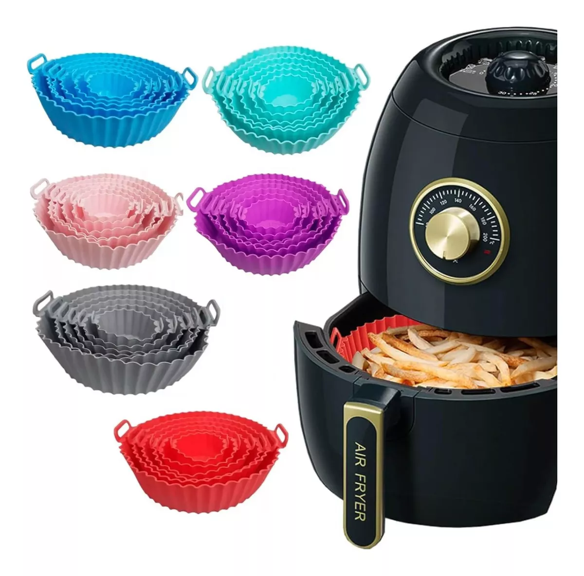 Molde de silicona se pueden usar repetidamente en lugar de papel pergamino inflamable y mantienen bien la comida fresca. El uso de una sartén de silicona para freidora de aire le brinda una experiencia de cocción más segura, más ecológica y mejor echo de silicona espesada de alta calidad, resistente al calor, resistente al desgaste, antiadherente, reutilizable, no se deforma ni daña fácilmente, y puede soportar temperaturas de hasta 464 °F ( 240°C), apto para microondas, vaporeras, hornos y otros utensilios de cocina.